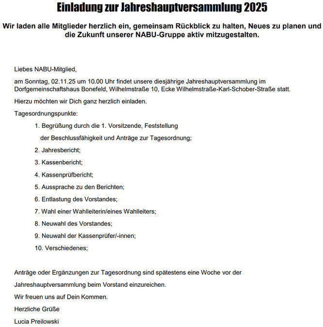 Sonntag, 02.11. 10 Uhr: Jahreshauptversammlung 2025