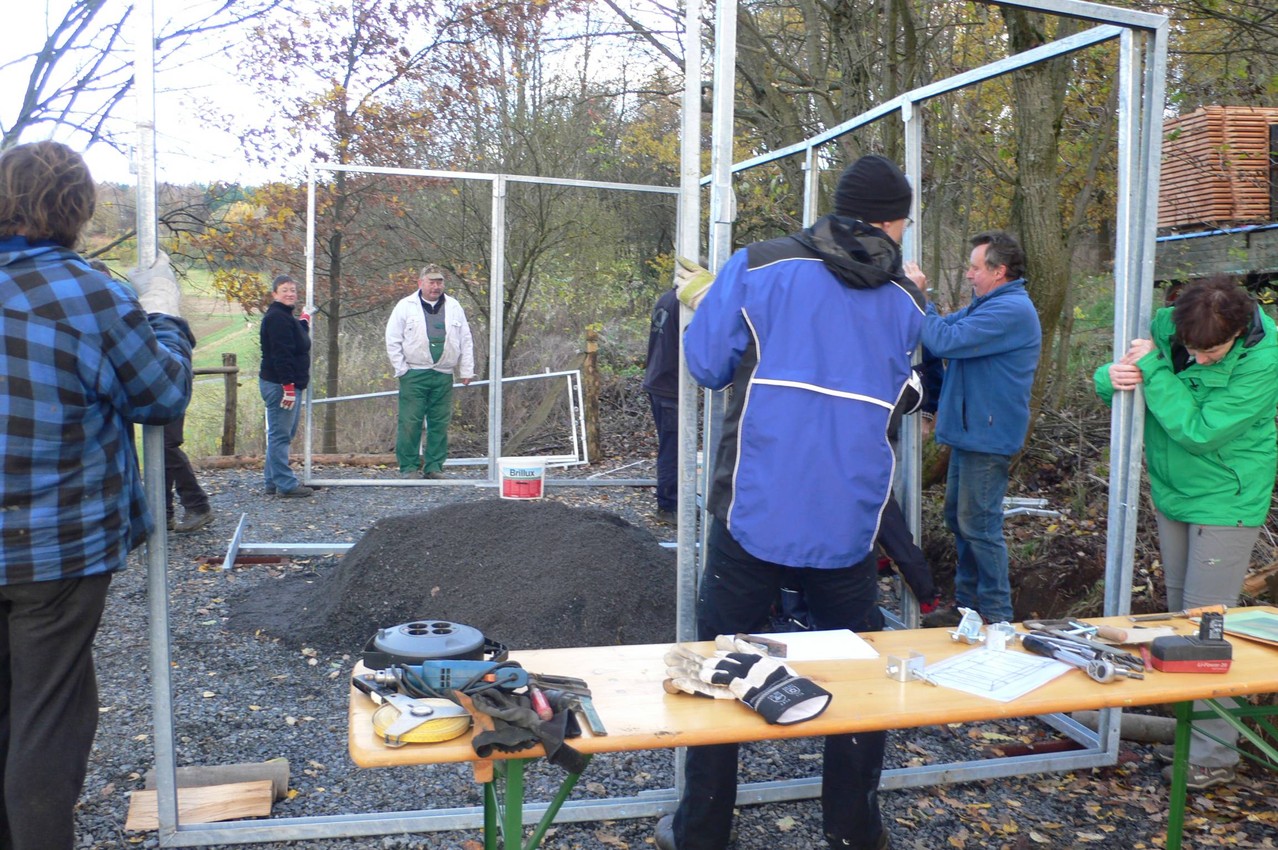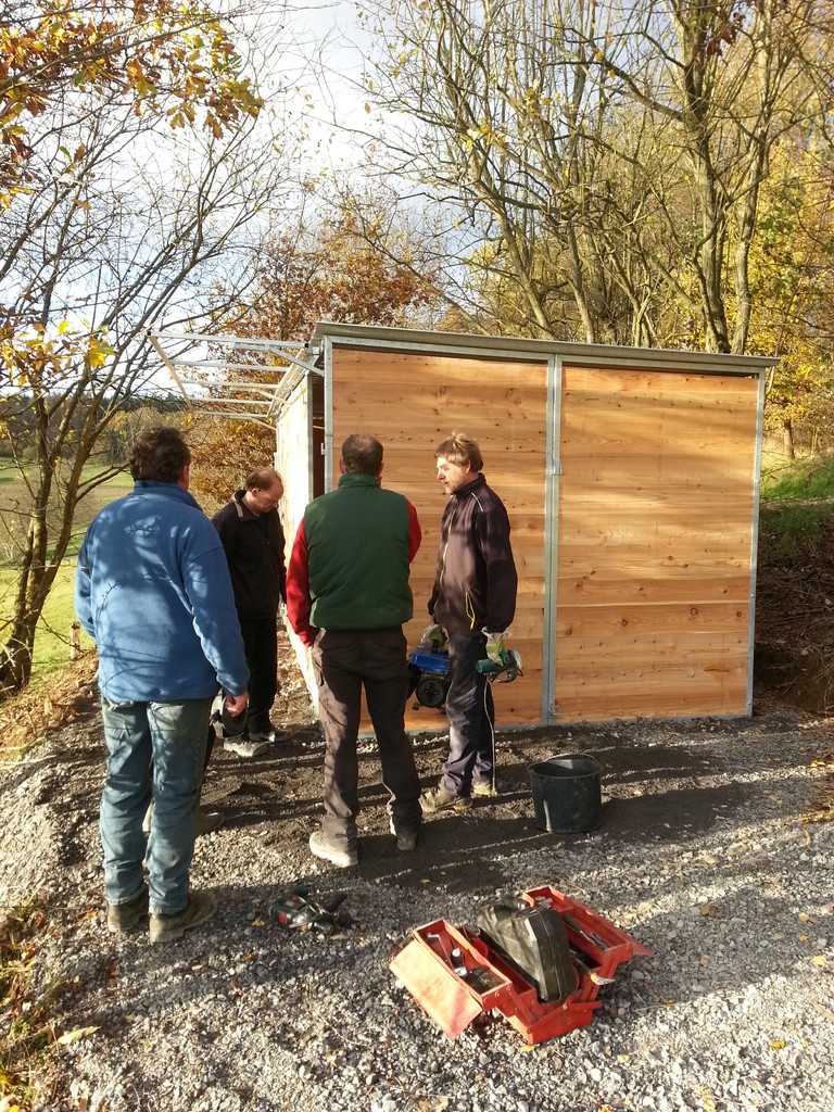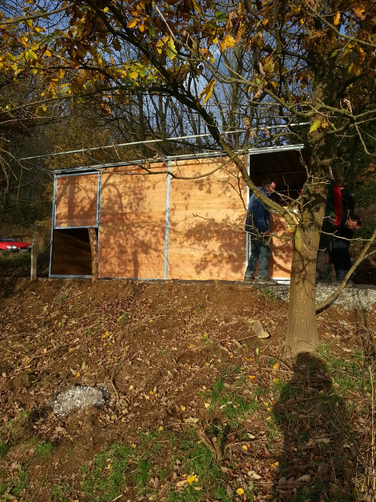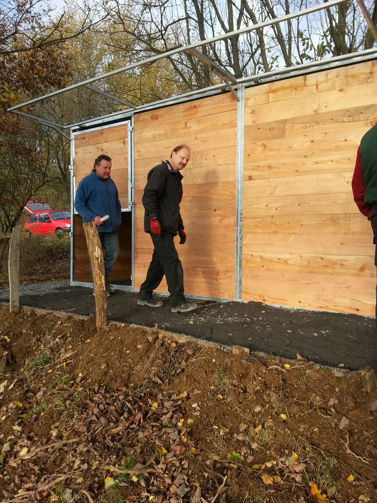 Am 9. November haben wir für die Heidschnucken eine Hütte aufgebaut, in die sich die Tiere bei schlechtem Wetter zurückziehen können. Die eine Hälfte steht den Tieren als Unterschlupf zur Verfügung, die andere Hälfte dient als Stroh- und Heulager.