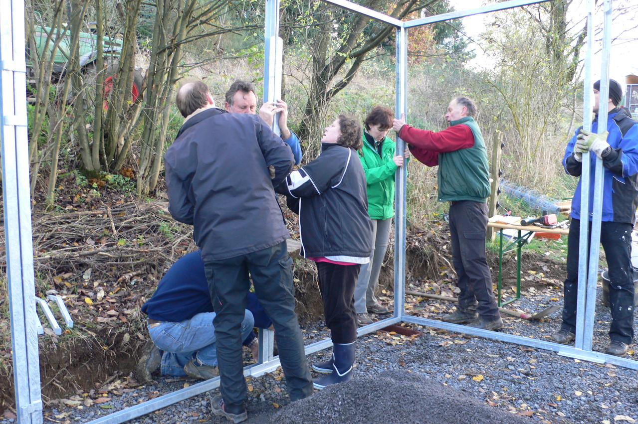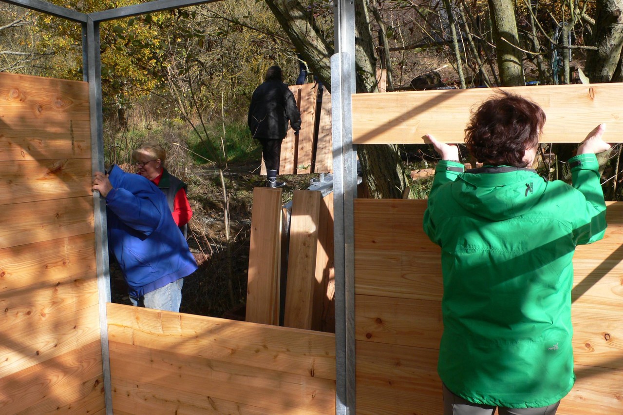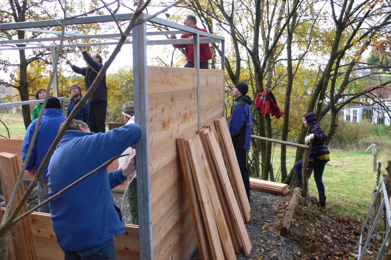 Am 9. November haben wir für die Heidschnucken eine Hütte aufgebaut, in die sich die Tiere bei schlechtem Wetter zurückziehen können. Die eine Hälfte steht den Tieren als Unterschlupf zur Verfügung, die andere Hälfte dient als Stroh- und Heulager.
