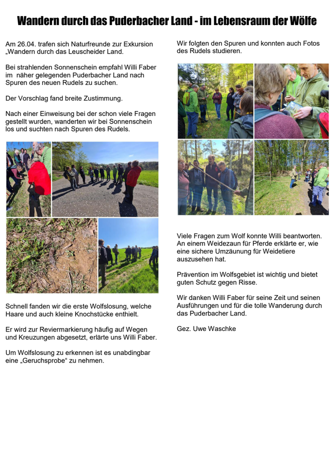 - Sicherung der Wolfshinweise verlässlich und entsprechend der fachlich richtigen Vorgehensweise ( Spuren sichern, Wolfslosung , Risse dokumentieren) und Weiterleitung an die entsprechenden regionalen Fachleute