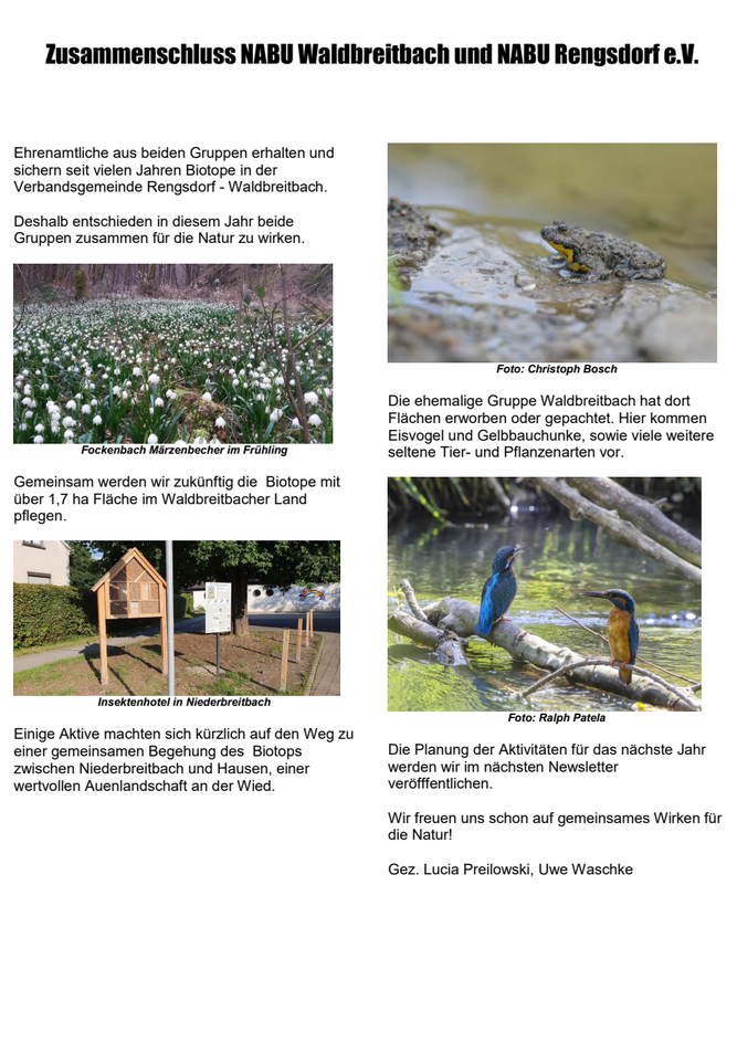 Der Integration der ehemaligen NABU Gruppe Waldbreitbach wurde einstimmig zugestimmt. Somit wird dort die wertvolle Biotopbetreuung von über 17.000 qm durch ehrenamtliche Tätigkeit vor Ort sichergestellt und weiter ausgebaut. Satzungsänderungen wurden ohne Gegenstimme angenommen Neben den notwendigen Änderungen aufgrund der neuen Satzung des Bundesverbandes wurden folgende wichtigen Punkte aufgenommen: Die Aufnahme Waldbreitbach in den Zuständigkeitsbereich unserer Gruppe. Formale Einladung zur Jahreshauptversammlung erfolgt zukünftig durch Ankündigung auf der Homepage.